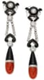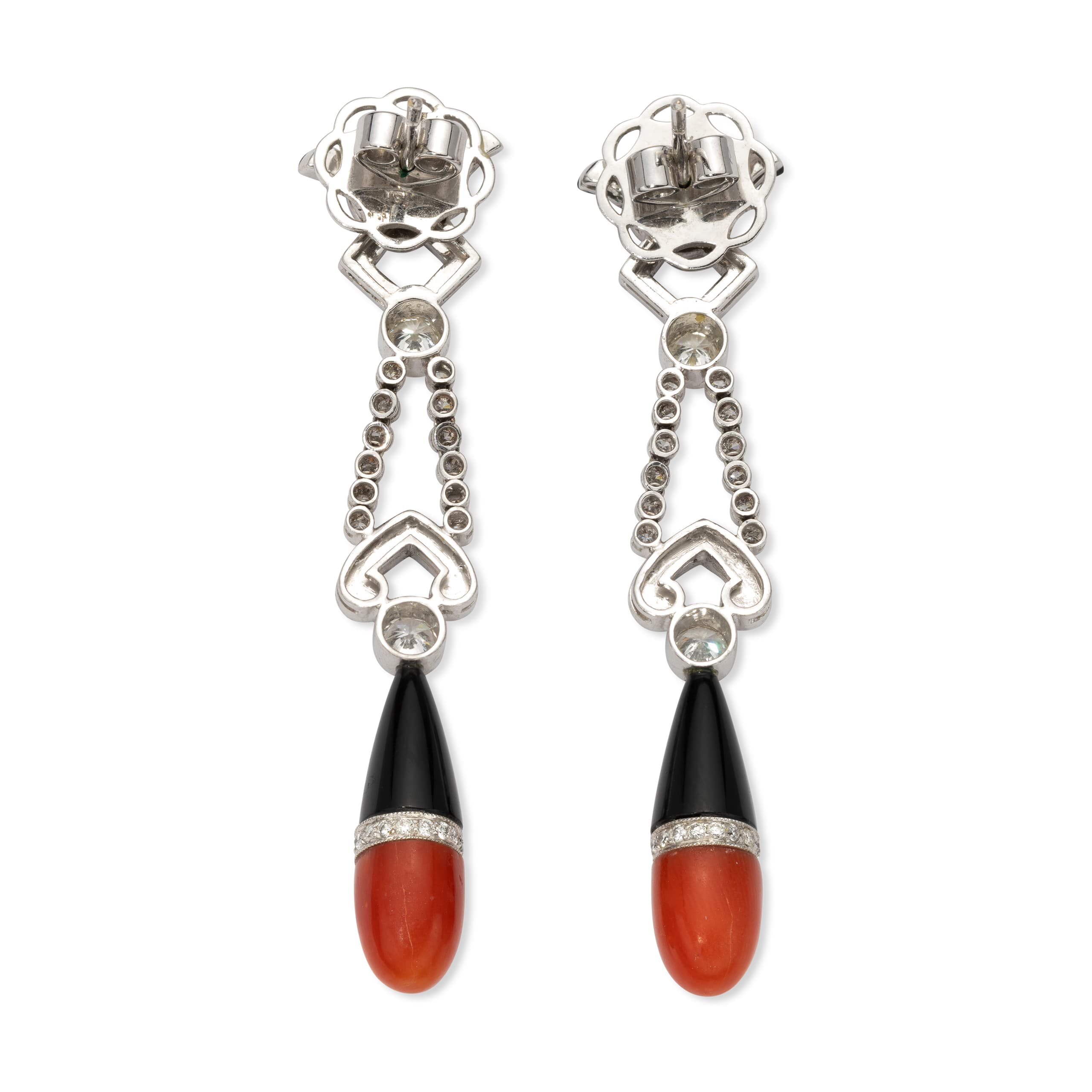18K WHITE GOLD, DIAMOND, ONYX AND CORAL PENDANT EARRINGS
