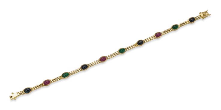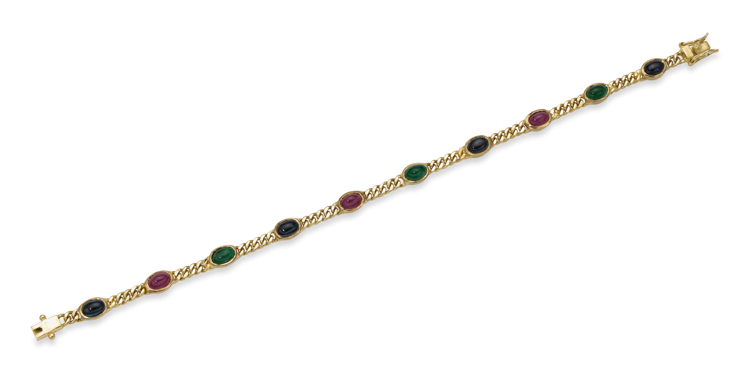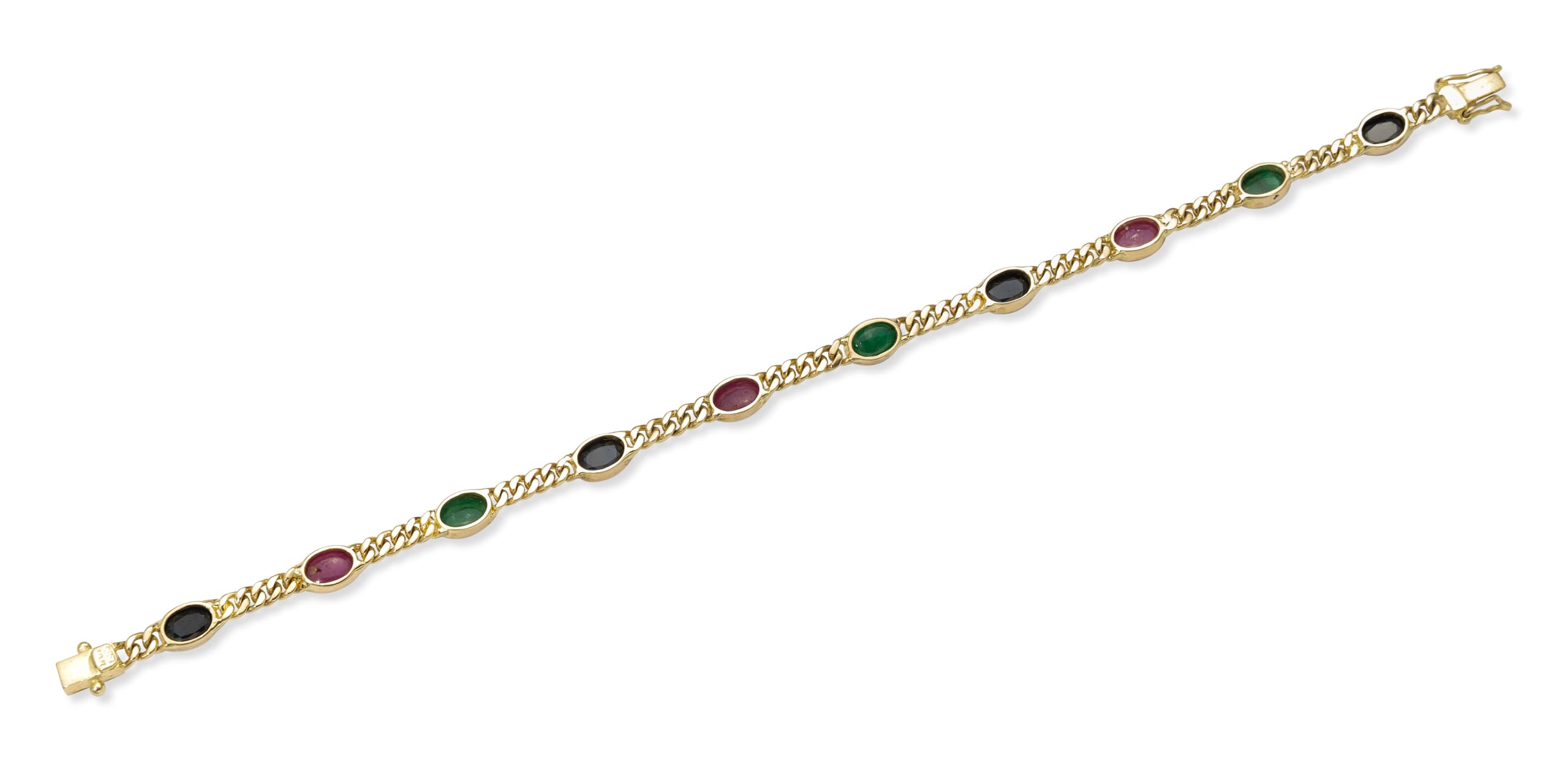 14k yellow gold bracelet set with three rubies weighing approximately 0.50 ct., three emeralds weighing approximately 0.40 ct., and four sapphires 0.60 ct.
