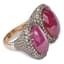 18k yellow gold ring set with two rubies weighing approximately 10 ct, surrounded by diamonds weighing 2,5 ct.