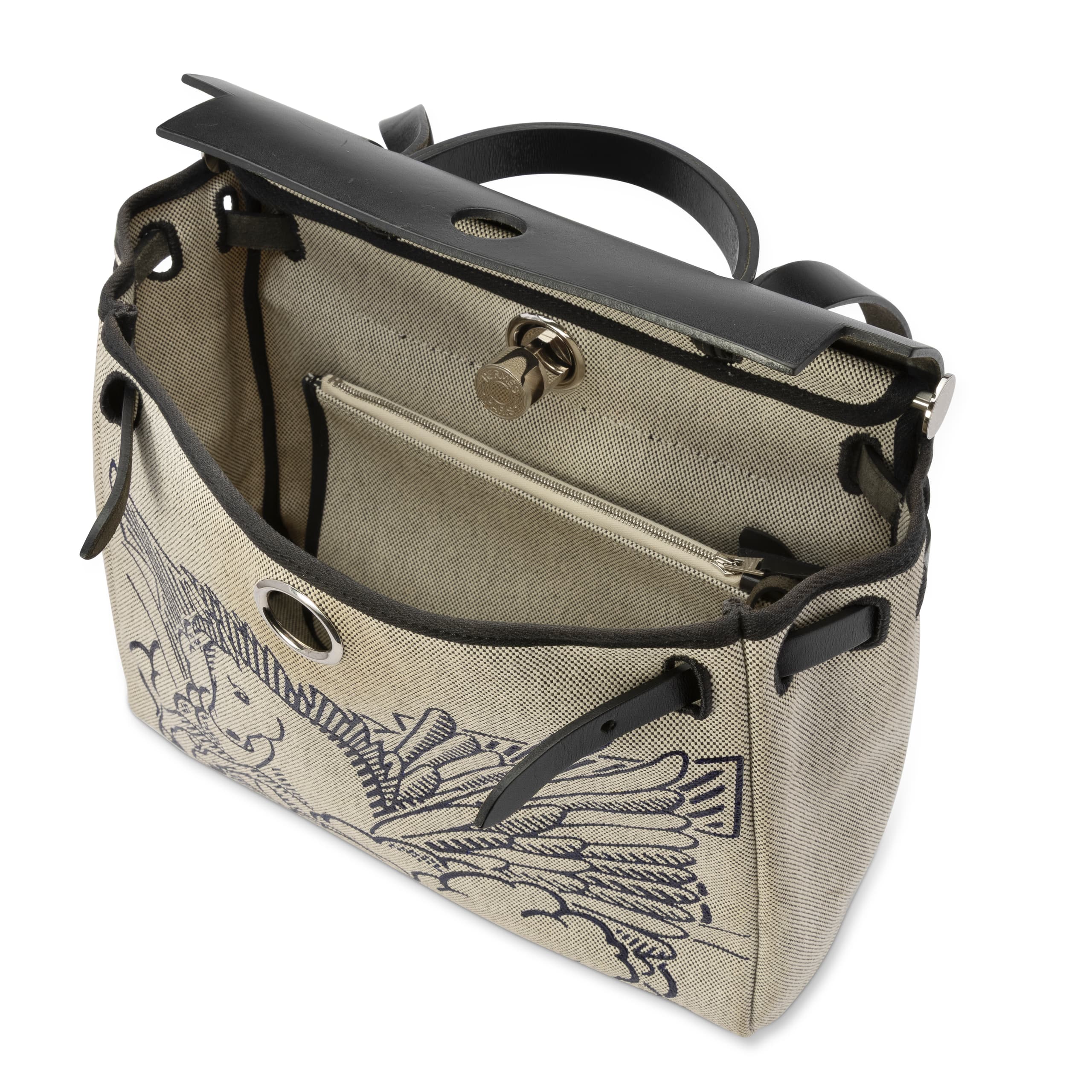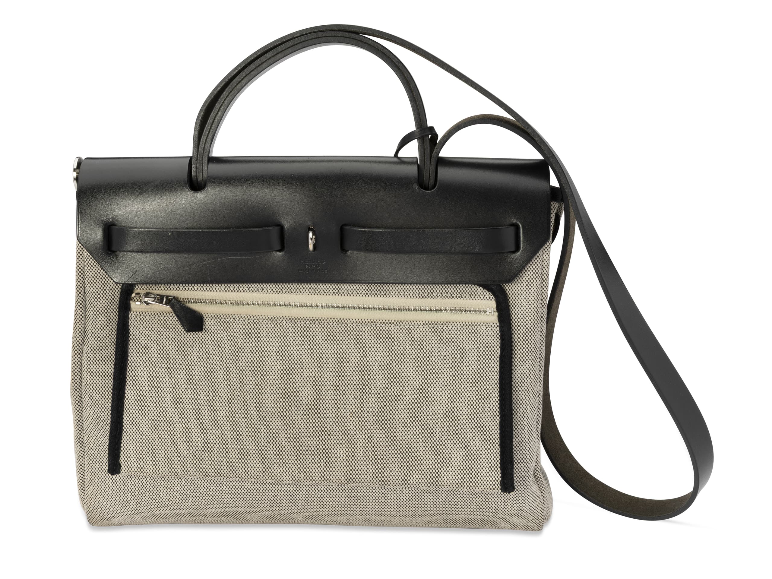 black vache hunter leather and bleu Indigo and ecru toile H Pegase Pop Herbag Zip 31 with palladium hardware with clochette including lock and two keys in their dustbag
