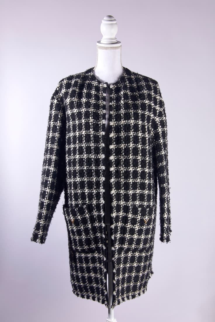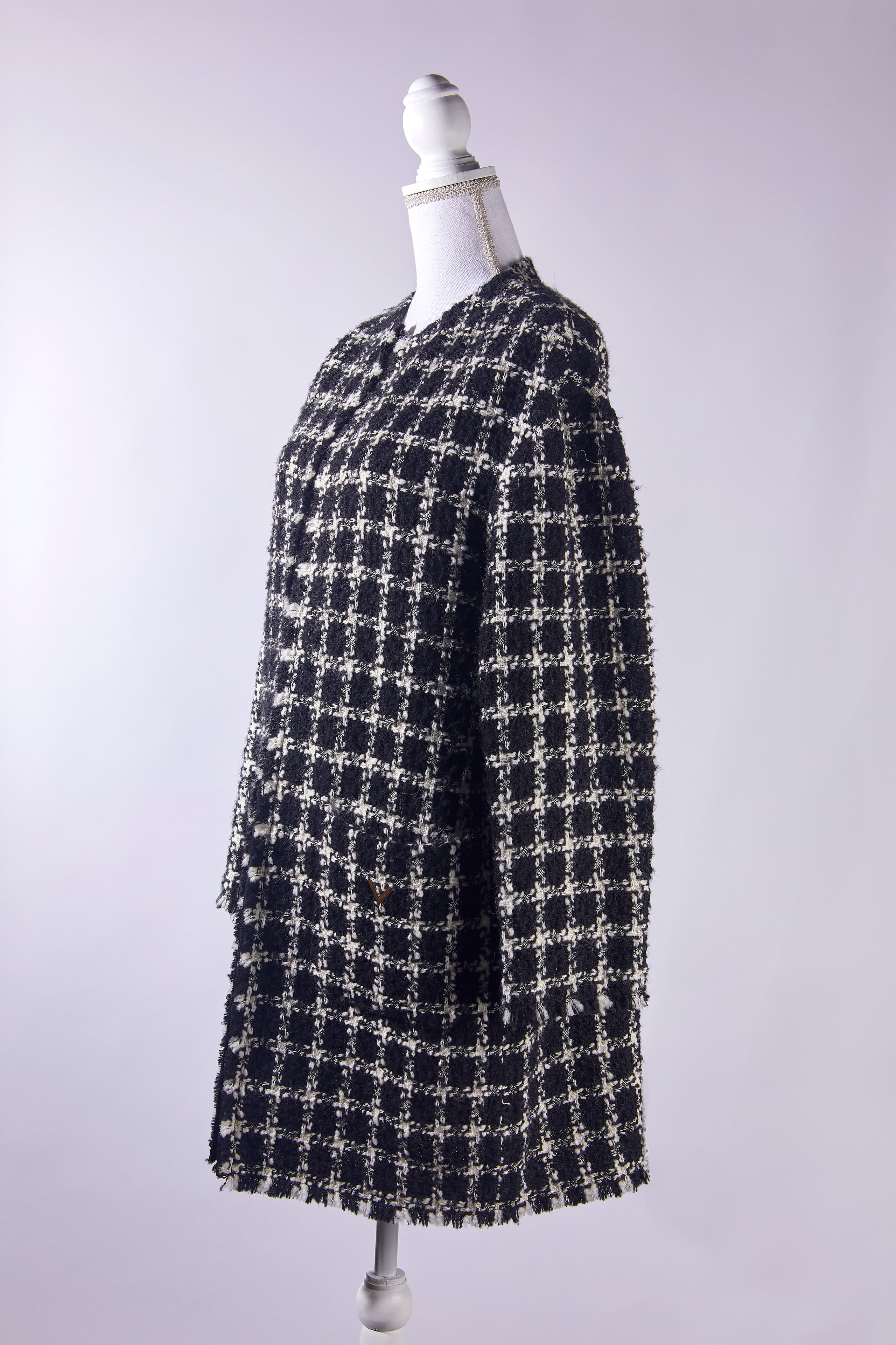 tailored with a polished cut, this wool-blend coat is finished with a houndstooth grid motif and trimmed with silk fringe adding contrasting texture. Two pockets with logo.