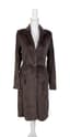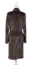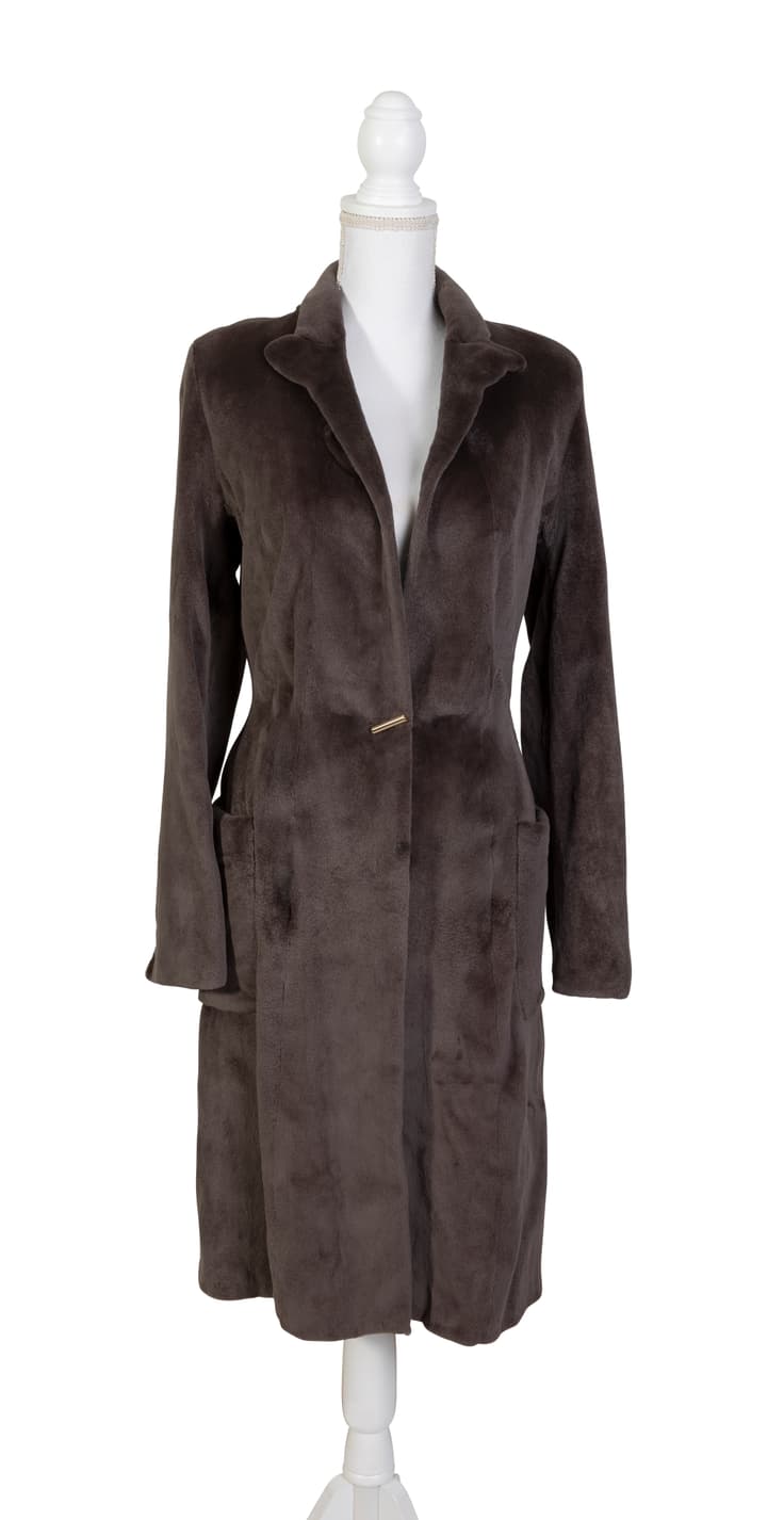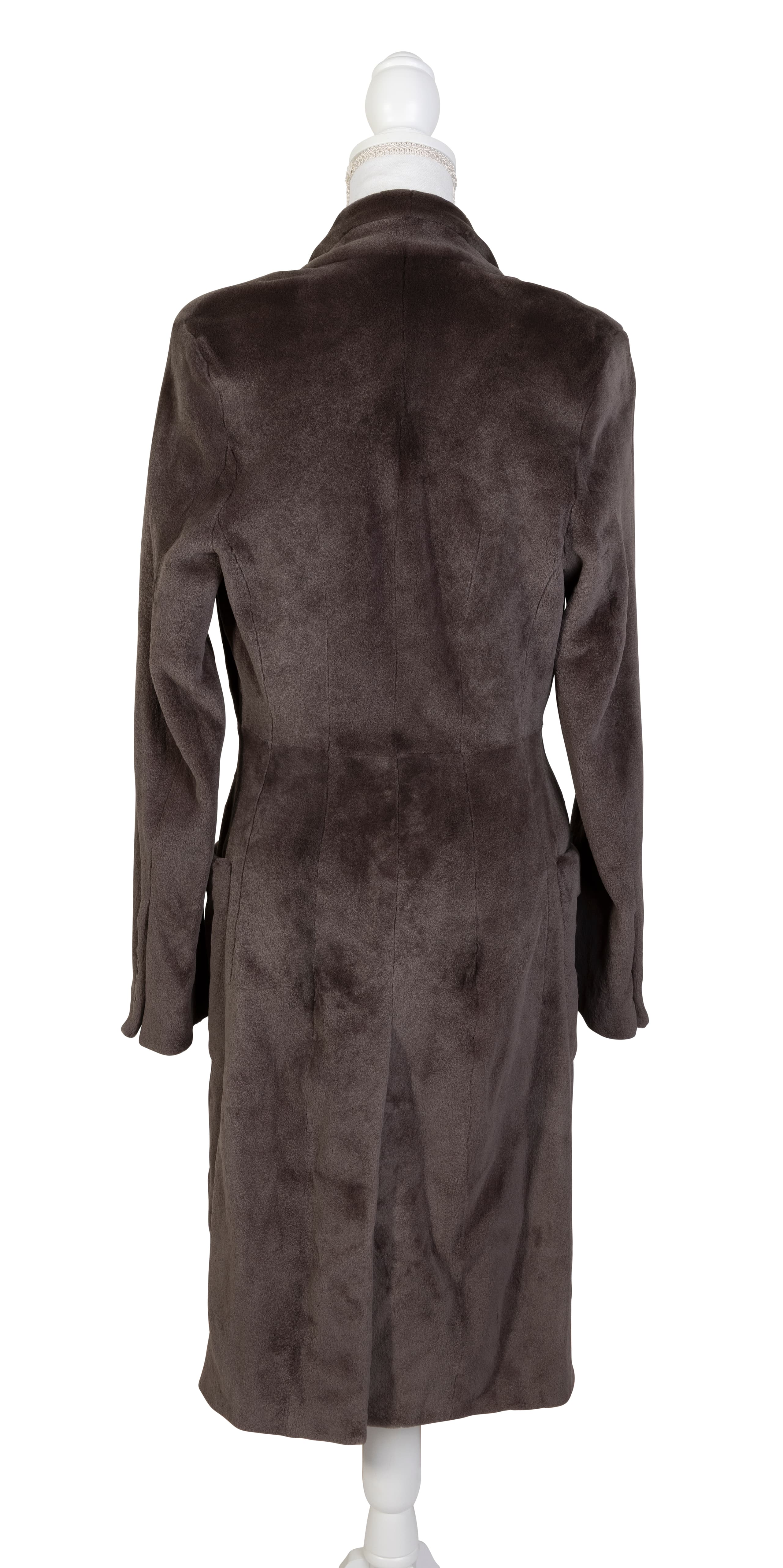 Taupe shaved mink coat with notched collar, single snap button closure under flap, two patch pockets, long set-in sleeves